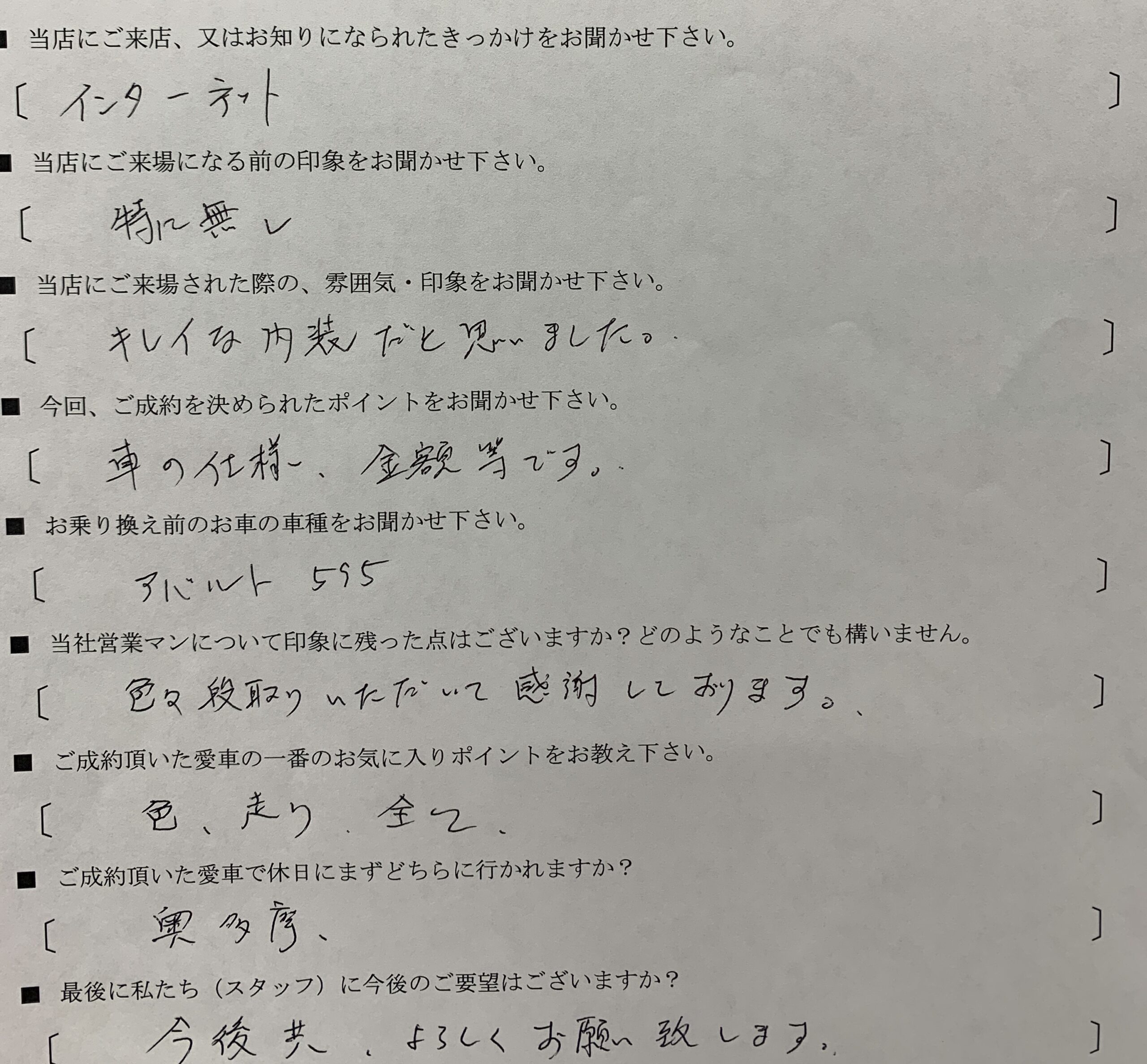 2025/09/21 ルノー所沢 A様、メガーヌRSのご納車おめでとうございます! こんにちは!ルノー所沢です! メガーヌRSをご納車させて頂きました、A様のご購入後のアンケートをご紹介させて頂きます。 A様、メガーヌRSのご納車おめでとうございます! また、アンケートにご協力頂き誠にありがとうございます。 メガーヌRSで奥多摩までドライブを存分に楽しまれて下さいね☆ 何か分からない事などございましたら、いつでもご連絡くださいませ。 今後とも宜しくお願い申し上げます。 この記事をシェアする