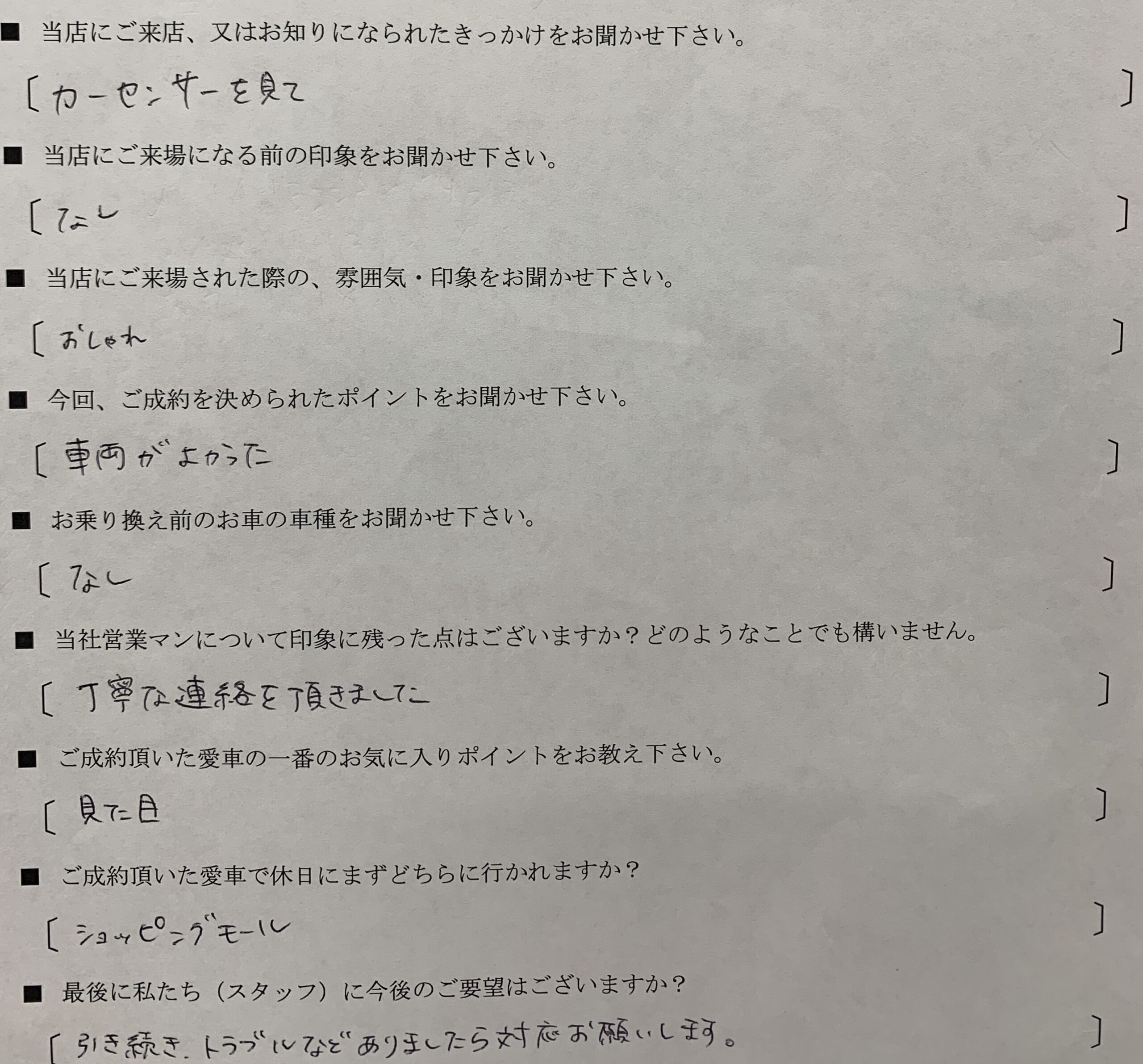 2025/09/21 ルノー所沢 G様、トゥインゴのご納車おめでとうございます! こんにちは!ルノー所沢です! トゥインゴをご納車させて頂きました、G様のご購入後のアンケートをご紹介させて頂きます。 G様、トゥインゴのご納車おめでとうございます! また、アンケートにご協力頂き誠にありがとうございます。 トゥインゴでショッピングを存分に楽しまれて下さいね☆ 何か分からない事などございましたら、いつでもご連絡くださいませ。 今後とも宜しくお願い申し上げます。 この記事をシェアする