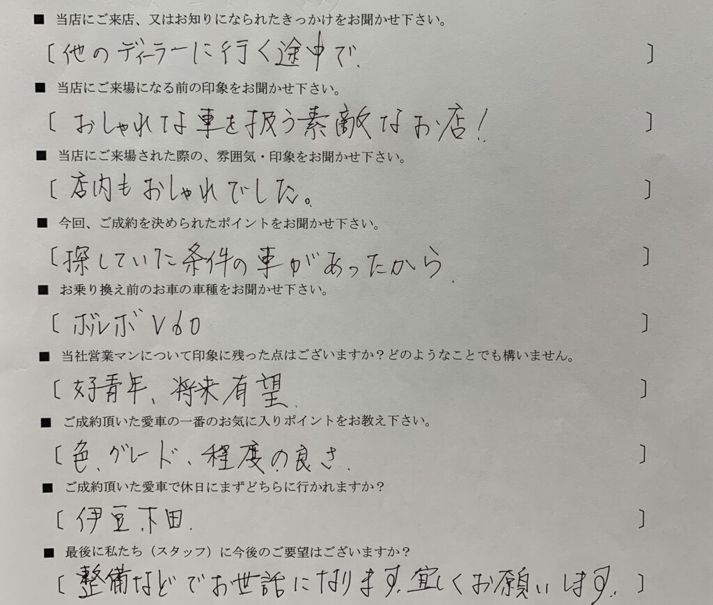 2025/10/19 ルノー所沢 H様、カングーのご納車おめでとうございます! こんにちは!ルノー所沢です! カングーをご納車させて頂きました、H様のご購入後のアンケートをご紹介させて頂きます。 H様、カングーのご納車おめでとうございます! また、アンケートにご協力頂き誠にありがとうございます。 カングーでドライブを存分に楽しまれて下さいね☆ 何か分からない事などございましたら、いつでもご連絡くださいませ。 今後とも宜しくお願い申し上げます。 この記事をシェアする