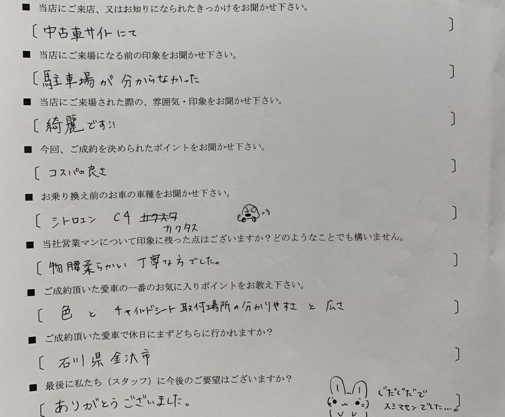 2025/10/19 ルノー所沢 Y様、アルカナのご納車おめでとうございます! こんにちは!ルノー所沢です! アルカナをご納車させて頂きました、Y様のご購入後のアンケートをご紹介させて頂きます。 Y様、アルカナのご納車おめでとうございます! また、アンケートにご協力頂き誠にありがとうございます。 アルカナで金沢までドライブを存分に楽しまれて下さいね☆ 何か分からない事などございましたら、いつでもご連絡くださいませ。 今後とも宜しくお願い申し上げます。 この記事をシェアする