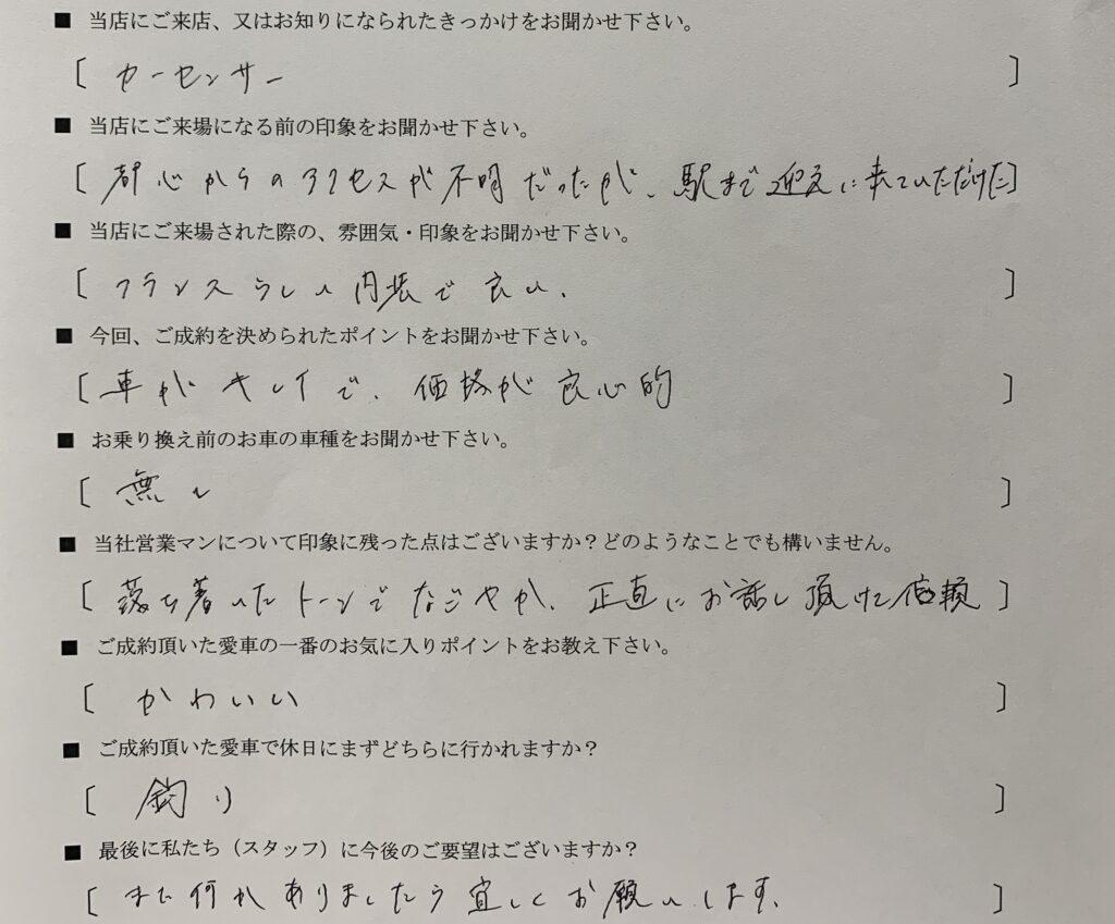 2025/10/19 カレボリンク所沢 A様、ジムニーのご納車おめでとうございます! こんにちは!カレボリンク所沢です。 ジムニーをご納車させて頂きました、A様のご購入後のアンケートをご紹介させて頂きます。 A様、ジムニーのご納車おめでとうございます! また、アンケートにご協力頂き誠にありがとうございます。 ジムニーで釣りを存分に楽しまれて下さいね☆ 何か不安な事がございましたら、いつでもご連絡下さいませ。 こちらこそ、今後とも宜しくお願い申し上げます。 この記事をシェアする