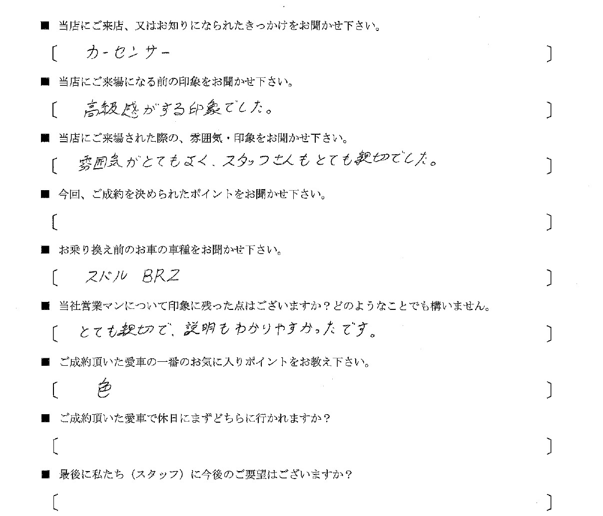 2025/12/05 カレボリンク所沢 D様、アウディS1のご納車おめでとうございます! こんにちは!カレボリンク所沢です! アウディS1をご納車させて頂きました、D様のご購入後のアンケートをご紹介させて頂きます。 D様、アウディS1のご納車おめでとうございます! また、アンケートにご協力頂き誠にありがとうございます。 S1を存分に楽しまれて下さい^^ お車でお困りの事などございましたら、お気軽にご連絡くださいませ。 今後とも宜しくお願い申し上げます。 この記事をシェアする