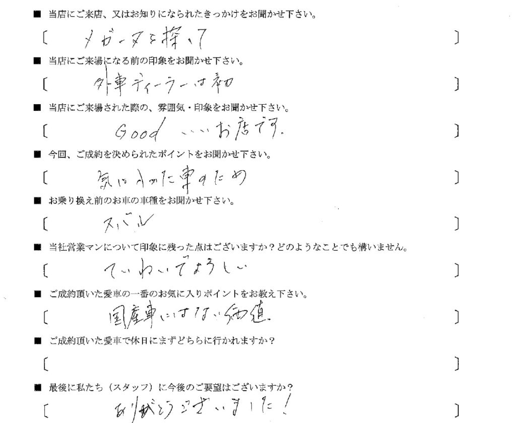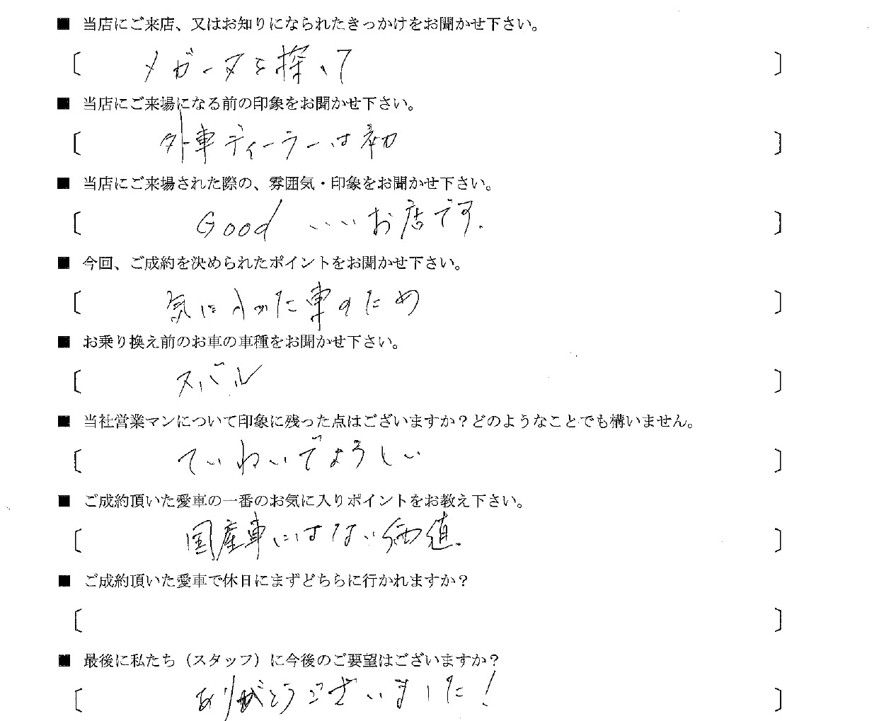 2025/12/05 ルノー所沢 S様、メガーヌのご納車おめでとうございます! こんにちは!ルノー所沢です! メガーヌをご納車させて頂きました、S様のご購入後のアンケートをご紹介させて頂きます。 S様、メガーヌのご納車おめでとうございます! また、アンケートにご協力頂き誠にありがとうございます。 メガーヌならではの走りを楽しまれて下さいね☆ 不安な事やお困り事などございましたら、お気軽にご連絡くださいませ。 今後とも宜しくお願い申し上げます。 この記事をシェアする